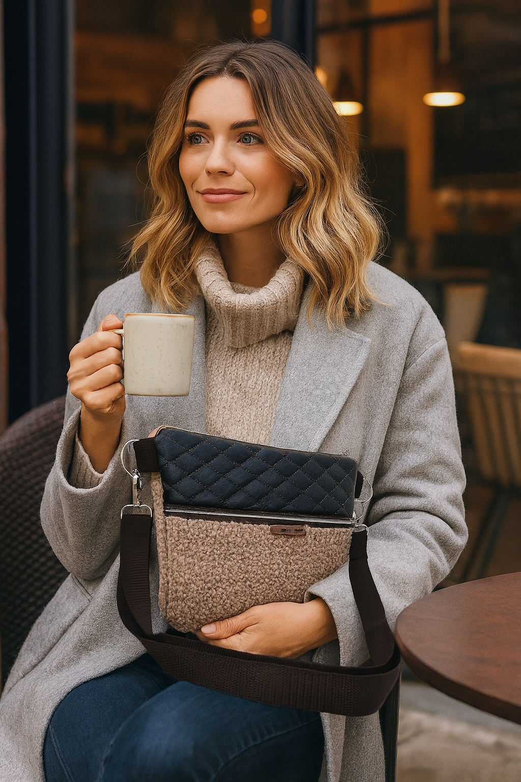 Die Damen-Schulter-Tasche vereint stilvolles Design mit praktischer Funktionalität. Die Vorderseite besteht aus einem Oberteil aus braunem, wabenförmig abgestepptem Kunstleder und einem Unterteil aus beigem Bouclé. Diese Kombination verleiht der Tasche einen eleganten und zugleich gemütlichen Look. Die Vorderseite bietet eine zusätzliche Tasche mit Reißverschluss. Diese praktische Ergänzung macht die Damen-Tasche ideal für den Alltag, da wichtige Kleinigkeiten schnell griffbereit sind.
